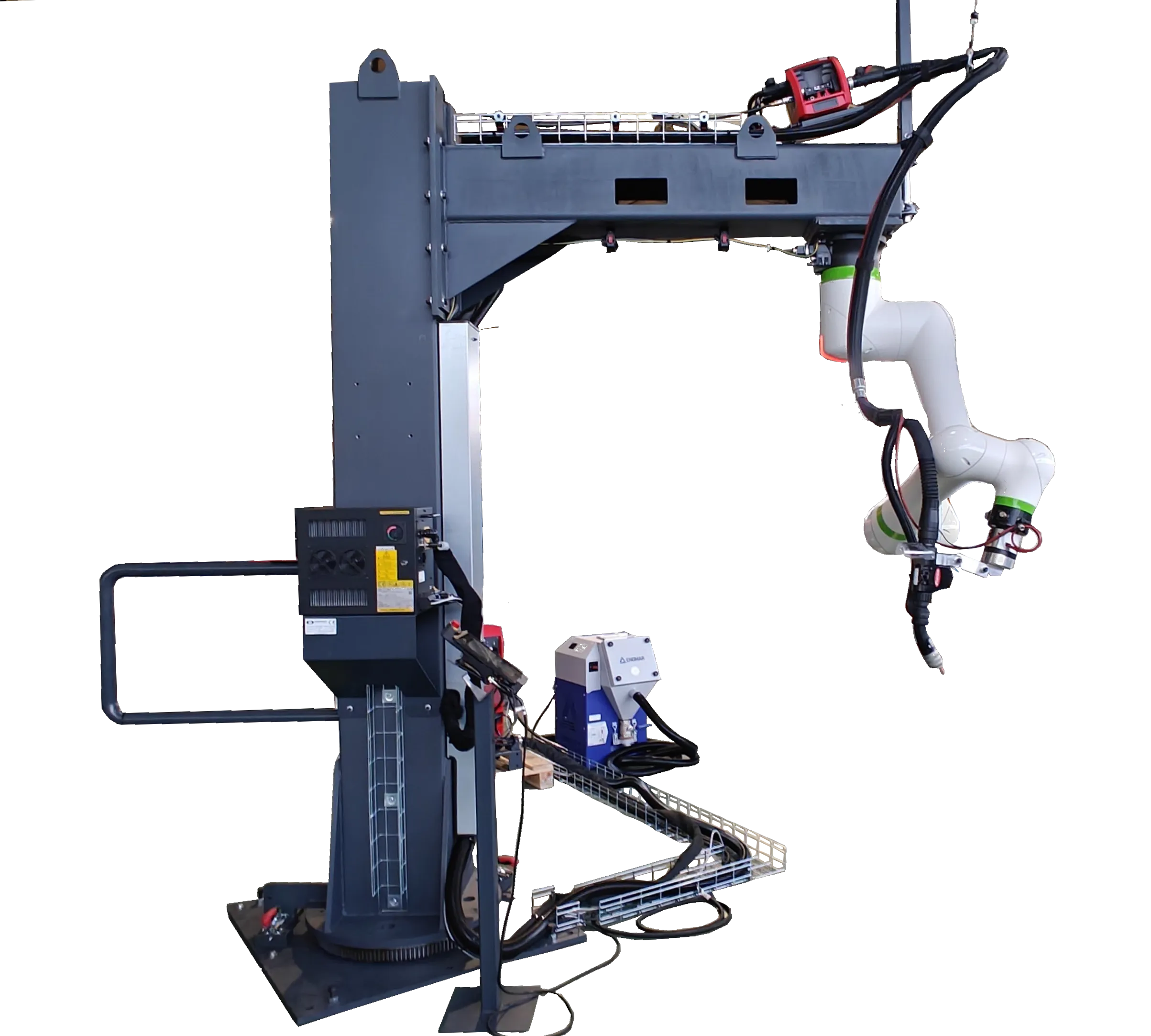 Large couverture : cobot FANUC CRX 30iA de rayon 1889 mm, mis en position suspendu pour exploiter au mieux les capacités du robot et donc maximiser les accès aux zones de soudage