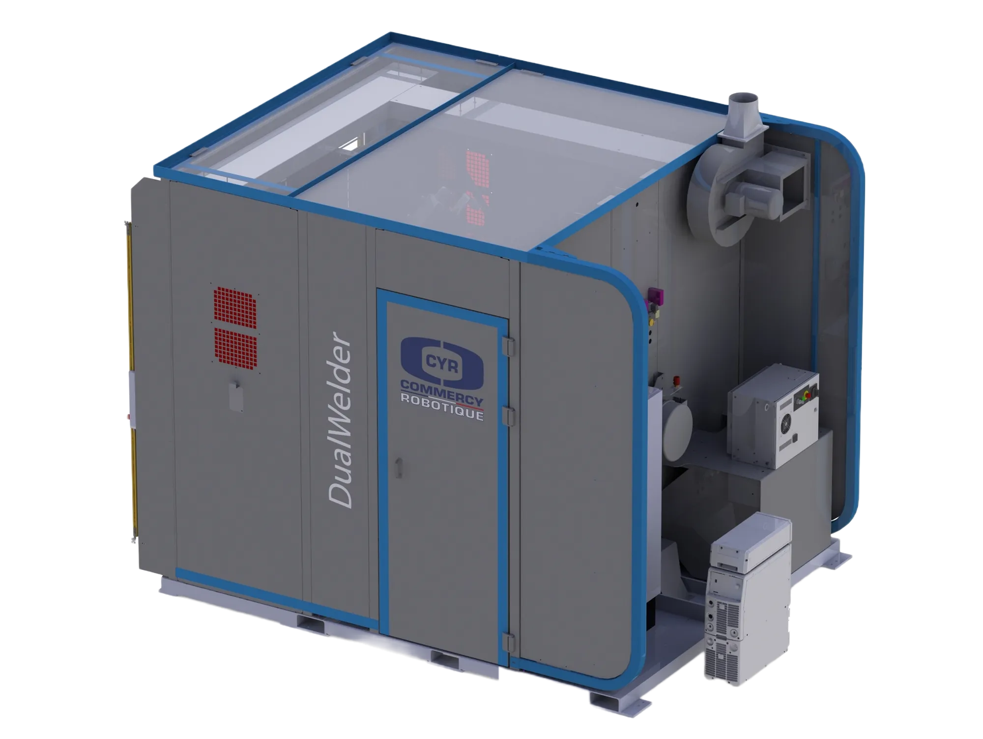 La cellule DualWelder est équipée d'un robot de soudage positionné face à deux postes de travail en ligne.